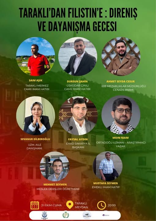 Sakarya İHH, Sakarya Evrensel Hafızlar Derneği ve Edunora Danışmanlık öncülüğünde, Filistin halkına destek amacıyla “Taraklı’dan Filistin’e Direniş ve Dayanışma Gecesi” düzenlenecek.