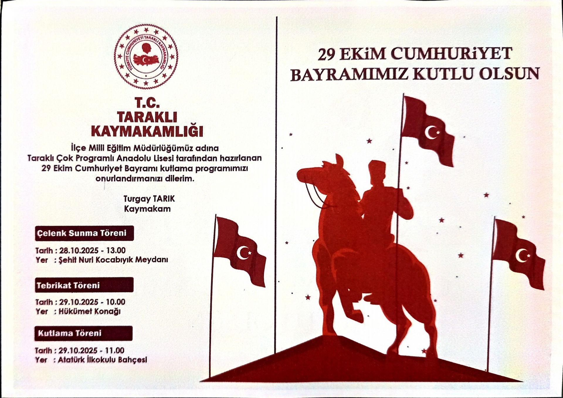 Cumhuriyet Bayramı’nın resmi kutlama programı ise 29 Ekim 2025 Çarşamba günü devam edecek. Saat 10.00’da Hükümet Konağı’nda tebrikat töreni yapılacak. Ardından, saat 11.00’de Taraklı Atatürk İlkokulu bahçesinde düzenlenecek kutlama programı ile etkinlikler sürecek.