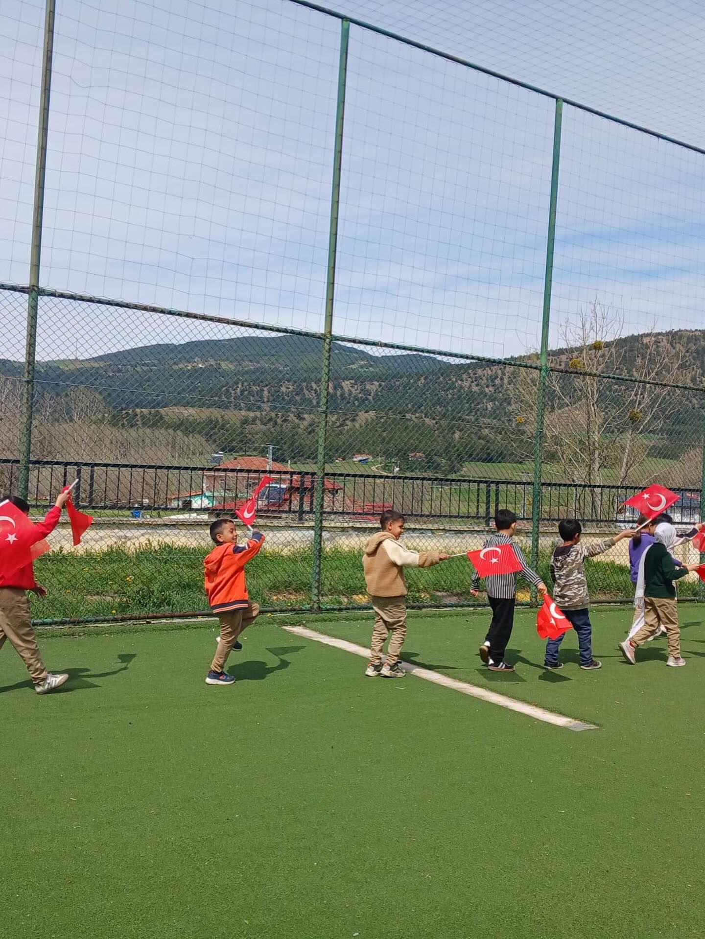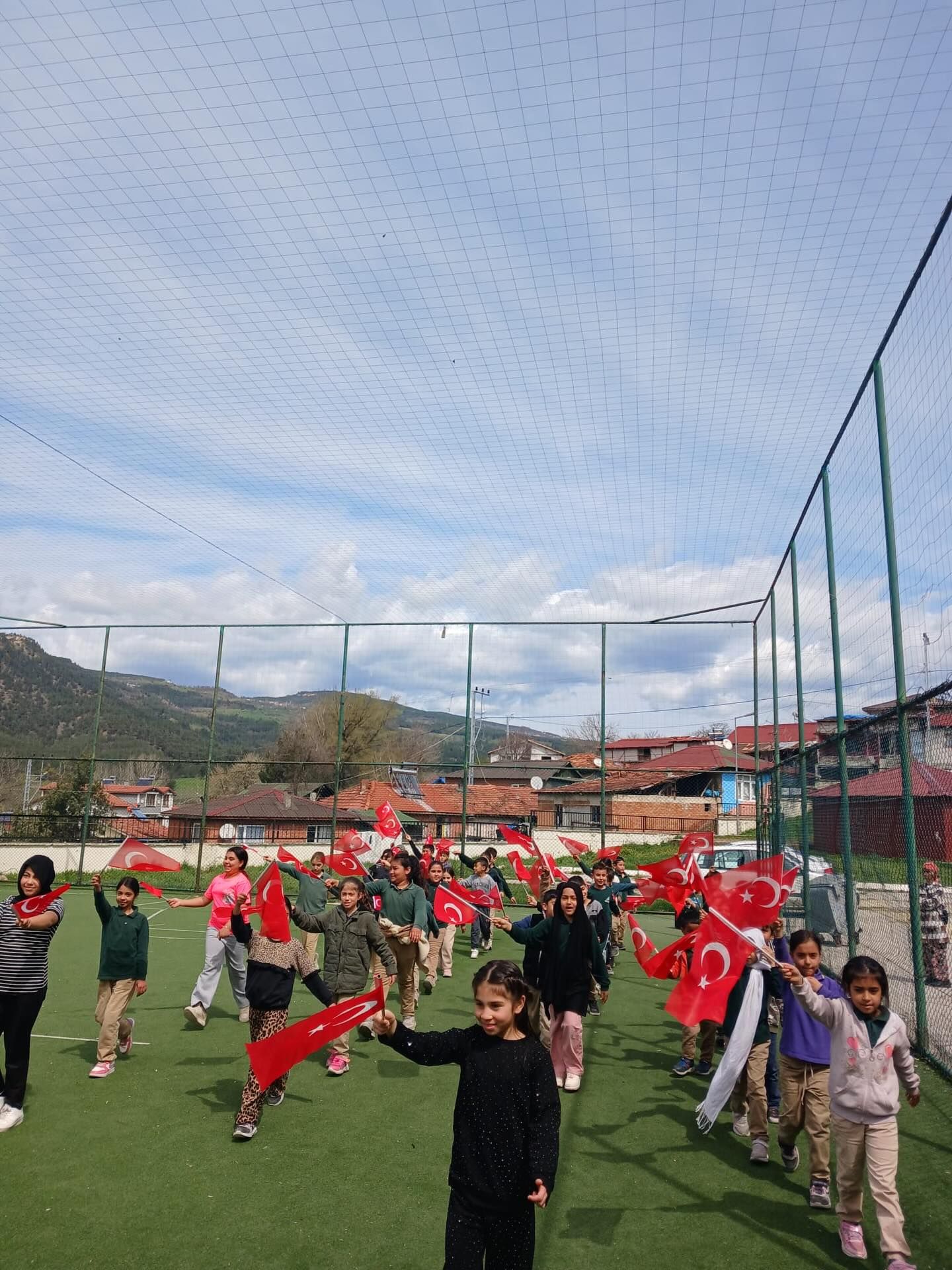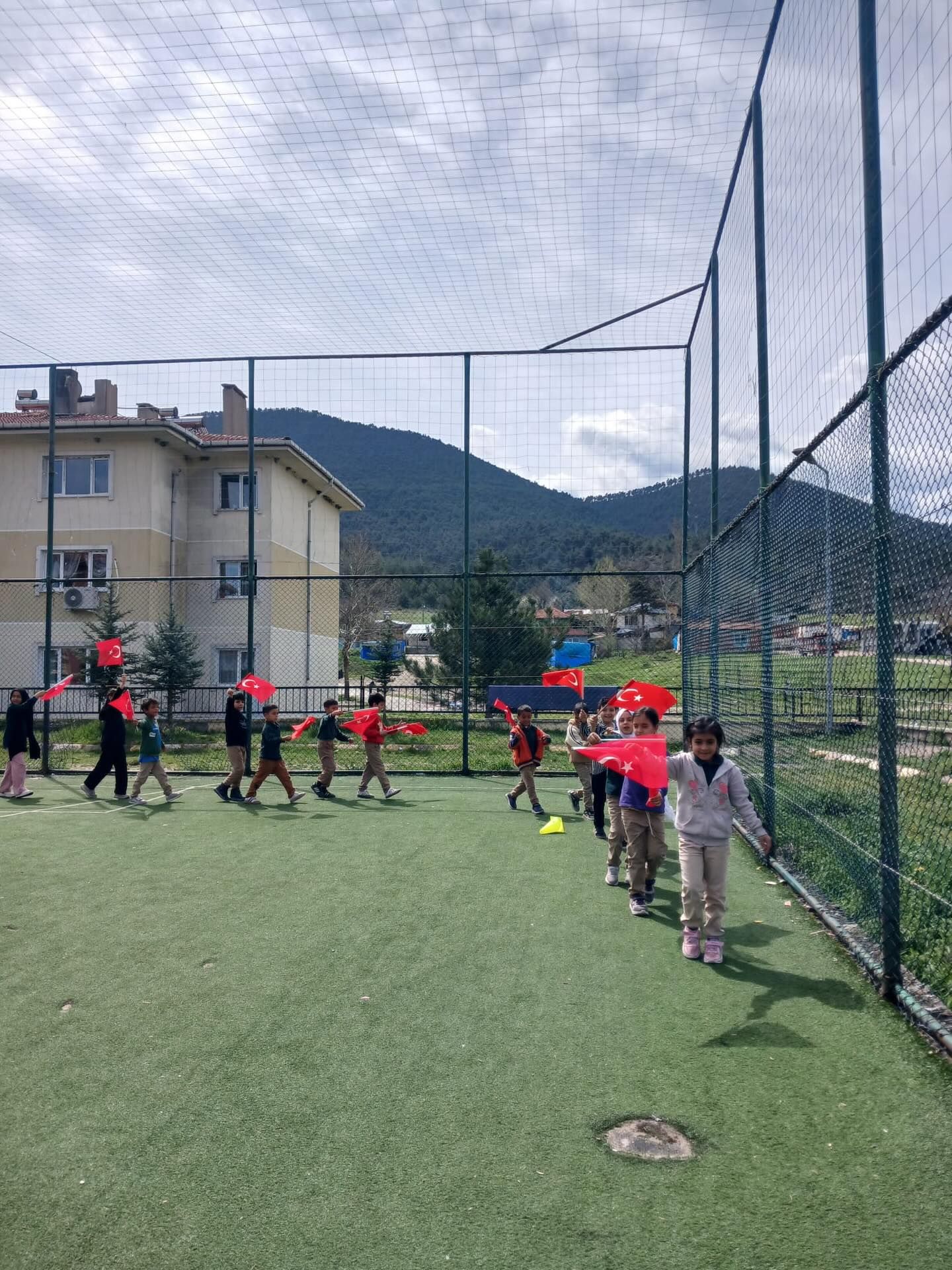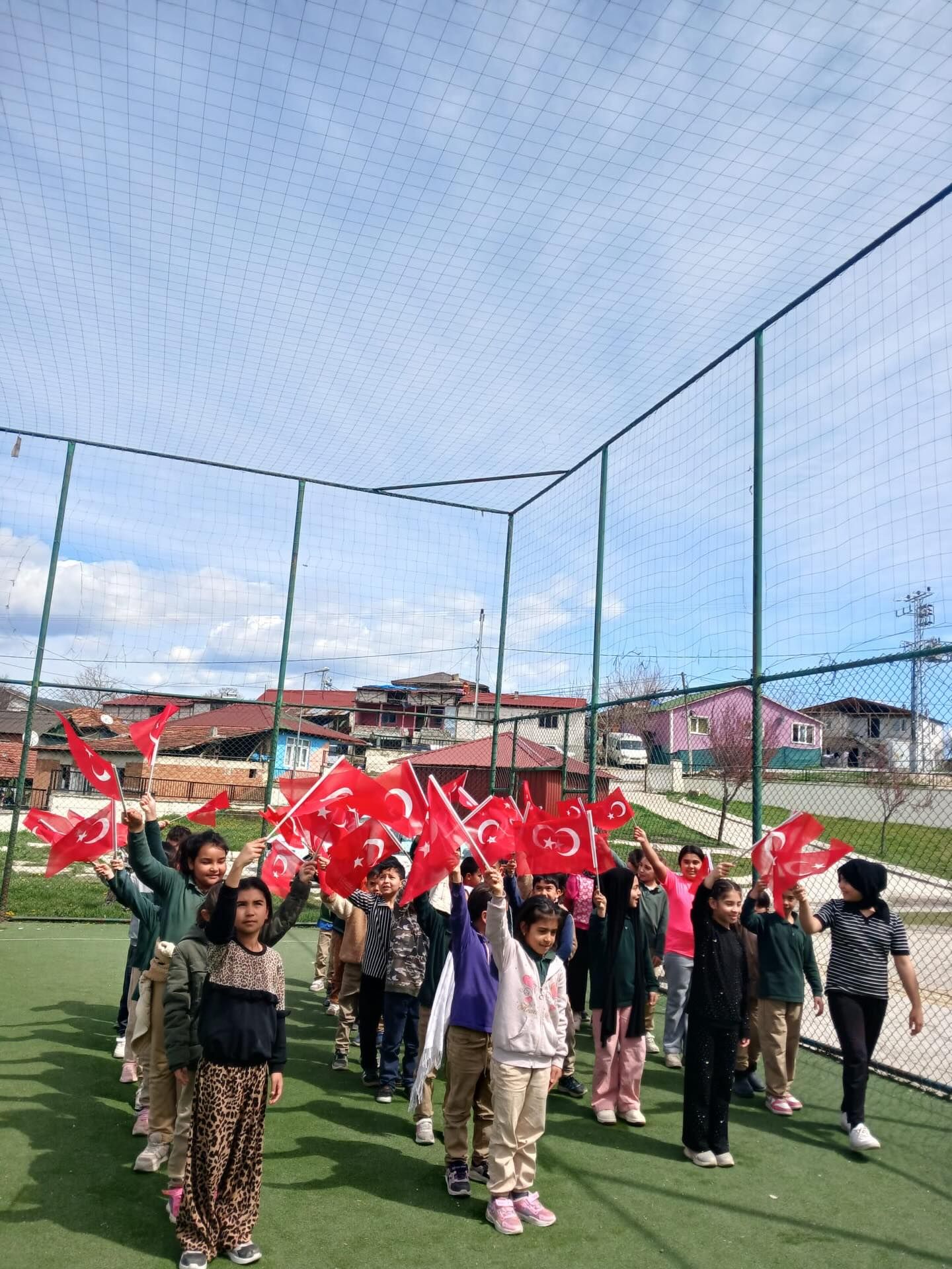 Okul yönetimi ve öğretmenlerin öncülüğünde gerçekleştirilen yürüyüşte, öğrenciler ellerinde Türk bayraklarıyla okul çevresinde yürüdüler.